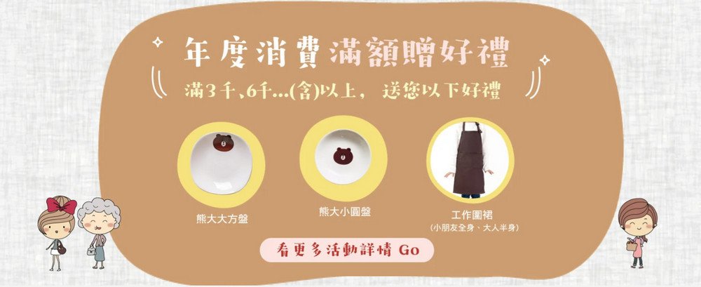 ● 消費滿9,000元送熊大方盤 + 熊大小圓盤 + 工作圍裙 (小朋友全身、大人半身) 乙組