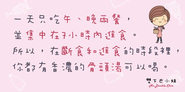 集中三餐時間,就是摧毀腹部脂肪最強大的武器。不必長時間斷食就能獲得成效。只要稍微集中三餐的時間,就能少掉好幾公斤,吃什麼都無所謂。這聽起來很不可思議,但其背後是有科學基礎的。2012 年,加州薩爾克生物研究所(Salk Institute)的科學家動物實驗發現,在限定時間內進食,可以減少高脂飲食的傷害。限制時間進食不但可預防肥胖症,還可扭轉肥胖症。建議,基本上,一天只吃午、晚兩餐,並集中在7小時內進食。所以,在斷食和進食的時段裡,你都有香濃的骨頭湯可以喝。