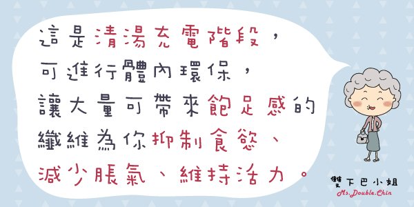 • 下午、兩餐之間,要喝下富含纖維、可排毒的蔬菜湯。這是清湯充電階段,可進行體內環保,讓大量可帶來飽足感的纖維為你抑制食慾、減少脹氣、維持活力。